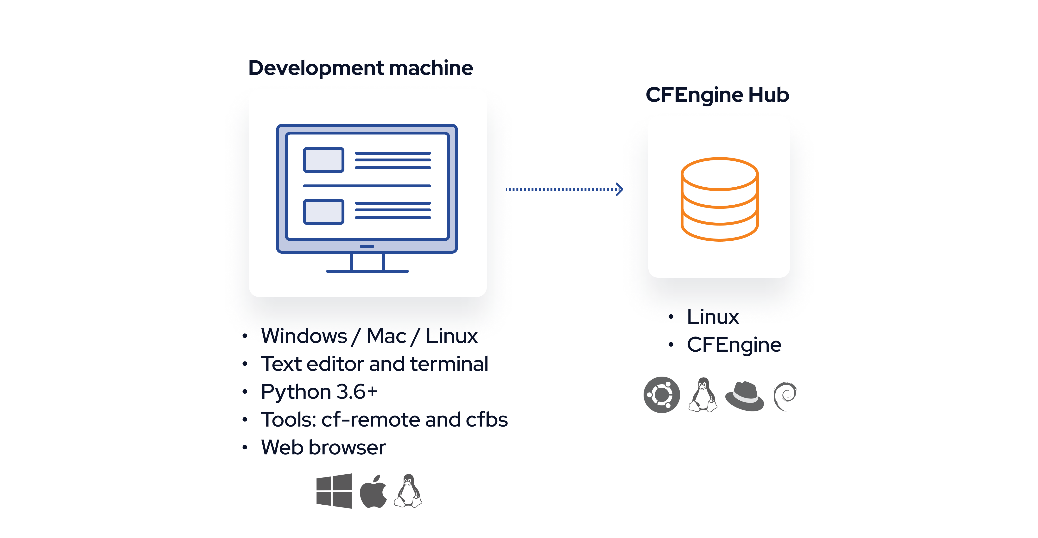 CFEngine runs on a wide variety of platforms, including Windows, Mac, Linux, and BSD. For this tutorial, to make things simple, we are going to recommend one way to install and work with CFEngine. We will use an Ubuntu 20.04 Linux virtual machine as the CFEngine Hub, and we will interact with it using SSH and some python tools which you can install on your desktop / laptop.