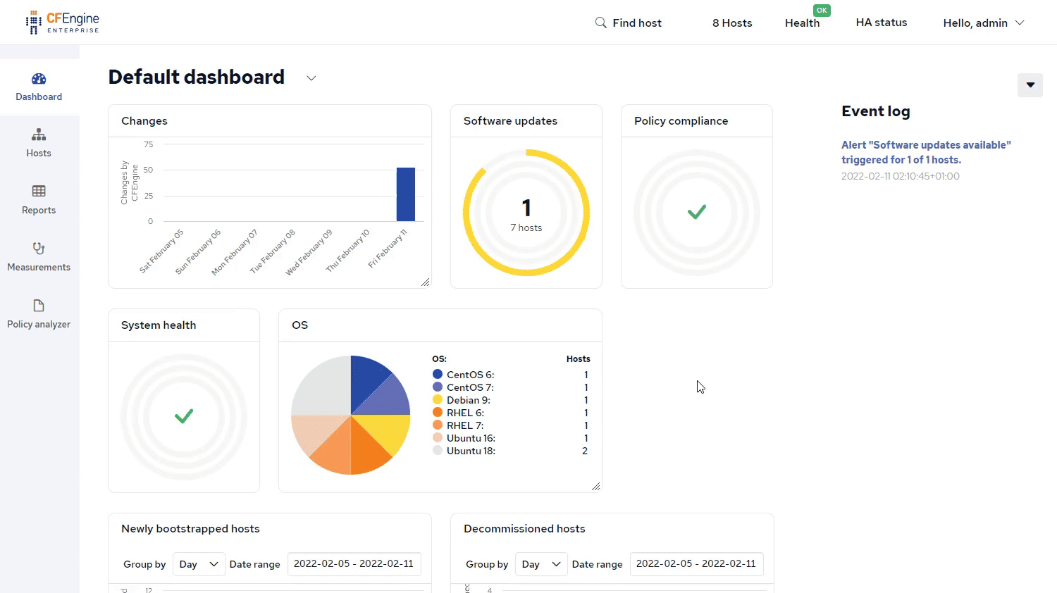 At this point you have a good overview of what CFEngine does, and you can choose to look around in Mission Portal, create your first Compliance Report, or find more modules on CFEngine Build . Once you feel comfortable with the CFEngine Hub, modules, and reports, you are ready to move on, and learn CFEngine’s expressive policy language and powerful module system. You’re not limited by what modules others have made, you can write the code you need to get things done: