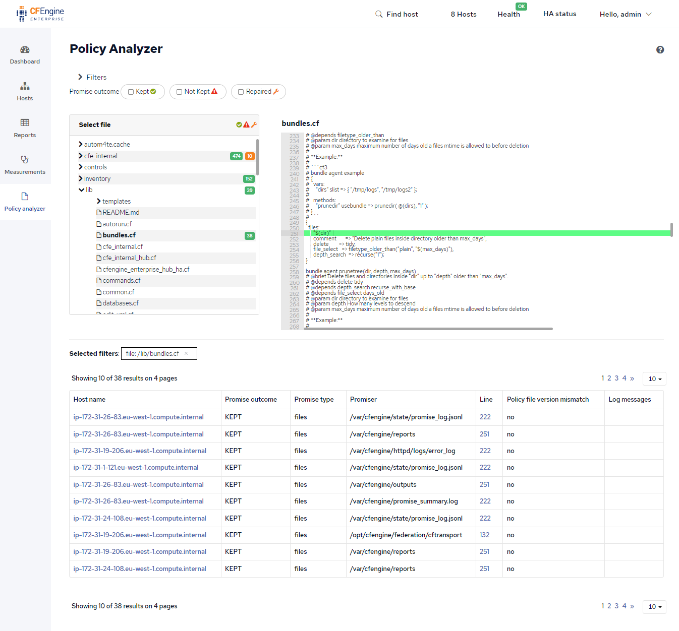 The Policy Analyzer tab will have a red counter if there are errors happening in your policy. In CFEngine, we call these Promises not kept, meaning the policy failed to do what it was supposed to, it failed to reach the desired state.
