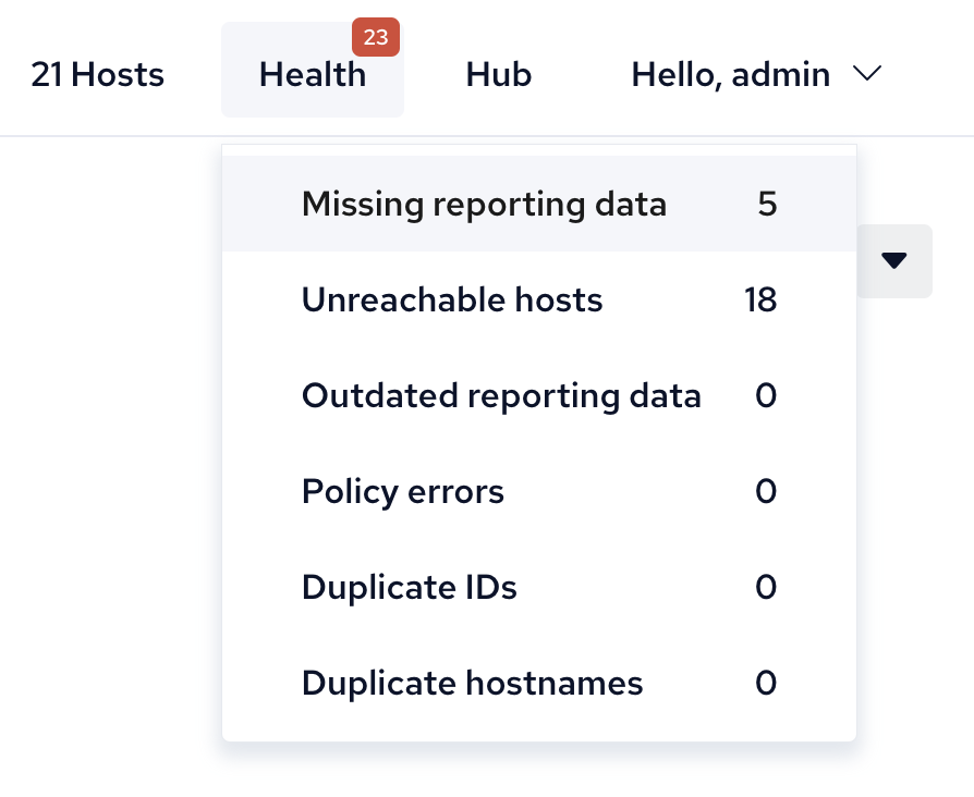 You can get quick access to the health of hosts, including direct links to reports, from the Health drop down at the top of every Enterprise UI screen. Hosts are listed as unhealthy if: